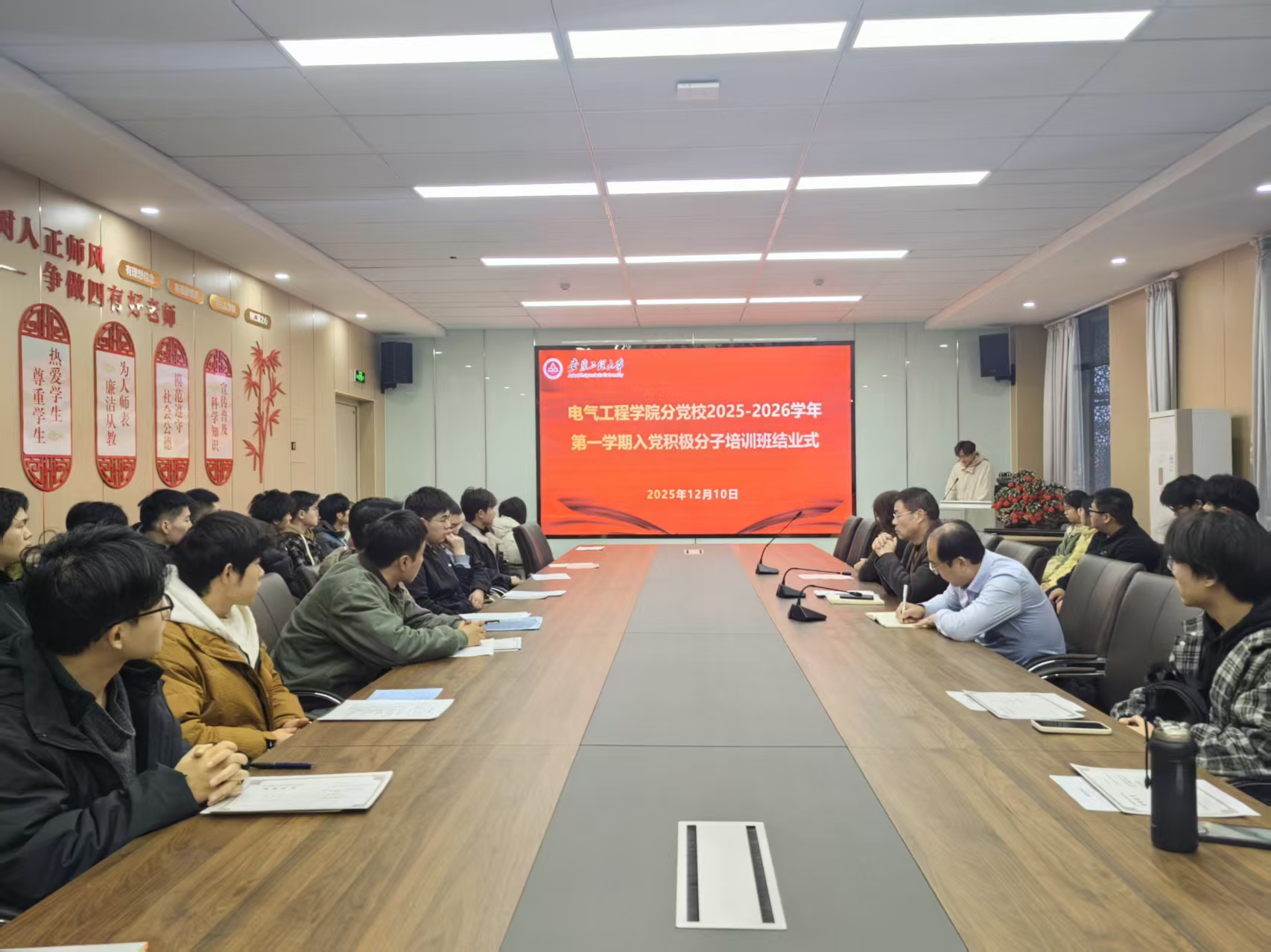 12月10日下午, jav 分党校2025-2026学年第一学期入党积极分子培训班结业式在国际工程师学院校区龙胜楼206会议室举行。学院党委书记张春、党委副书记迟传德、副处级组织员吴正霞,培训班班主任及全体学员参加。